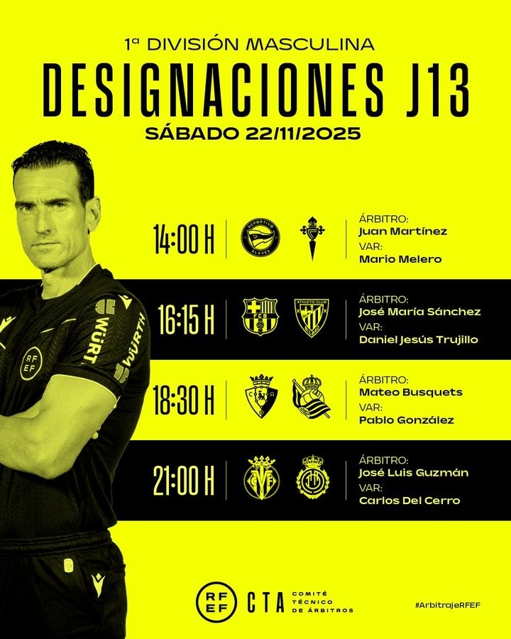 11月21日讯 西班牙足协今天公布了周六(含周日凌晨)西甲四场比赛的裁判名单,具体如下: