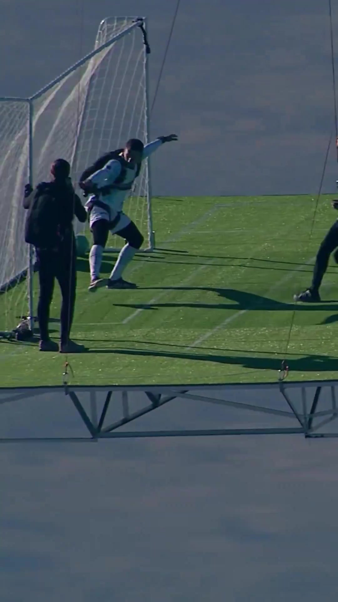 Boytsov和他的同伴背着降落伞包在这块被吊在半空的微型形状上踢球,在进球后Boytsov还作念出了“Siu”的庆祝当作,临了他也用这个当作从形状上一跃而下。