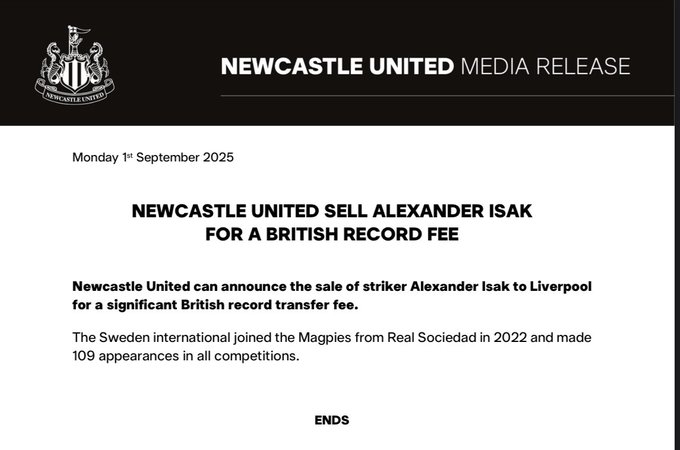 纽卡官网的声明:“纽卡斯尔联晓喻将先锋亚历山大-伊萨克以创英国转会费记录的价钱出售给利物浦。这位瑞典国脚于2022年从皇家社会转会至喜鹊,并在各项赛事中出场109次。”