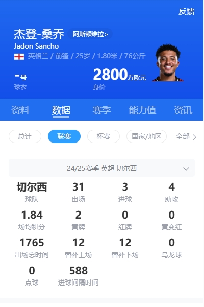 桑乔于2021年夏天从多特加盟曼联,曼联为他支付了8500万欧的转会费。桑乔于今为曼联出战83场比赛,交出12球6助。