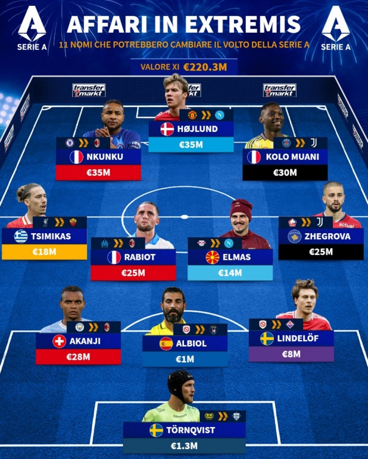 8月28日讯 德转官推本日更新,清点了在今夏转会范围日前潜在加盟意甲联赛的球员,并将这些球员以3-4-3的阵形列举出来,其中霍伊伦、恩昆库、穆阿尼等在列。