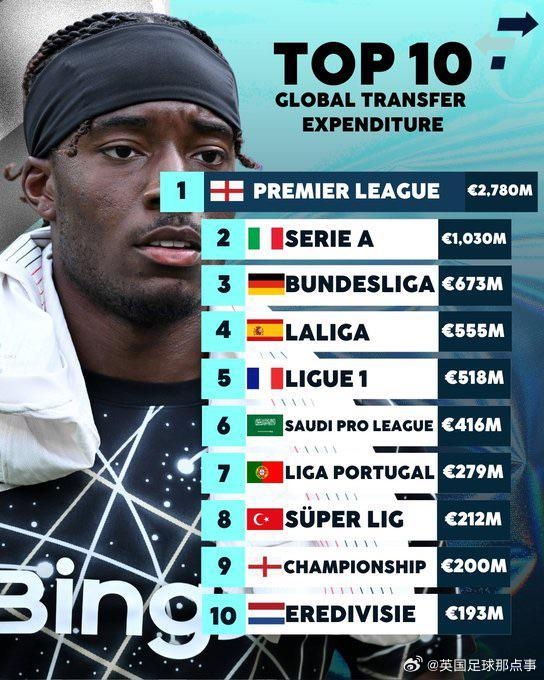💰民众夏窗转会榜单top10:英超27.8亿欧居首