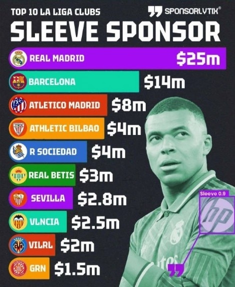 西甲中小球队的球衣“告白位”价值远逊于英超。