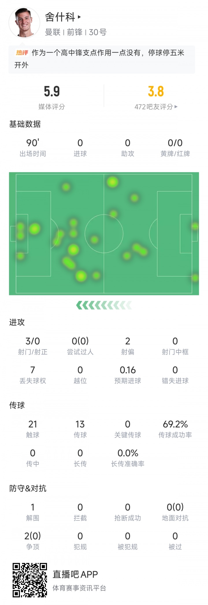 本场比赛22岁的舍什科打满全场,证明欠安,评分仅5.9分,低于6分的基础分。他的全场数据如下:3射0正0抵御,争顶0得手,21次触球7次丢球权,传球得手率69.2%。