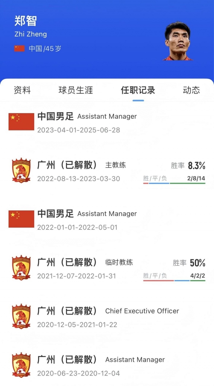 2021年12月7日,郑智出任广州队奉行主解释兼球员。2022年1月,41岁的郑智出战广州队vs长春亚泰的中超比赛,这是他作事生存临了一次出场。2022年8月,郑智出任广州队主解释。 2023年2月27日,郑智出任国足助教 。跟着伊万离任,郑智也退放洋足助教团队。