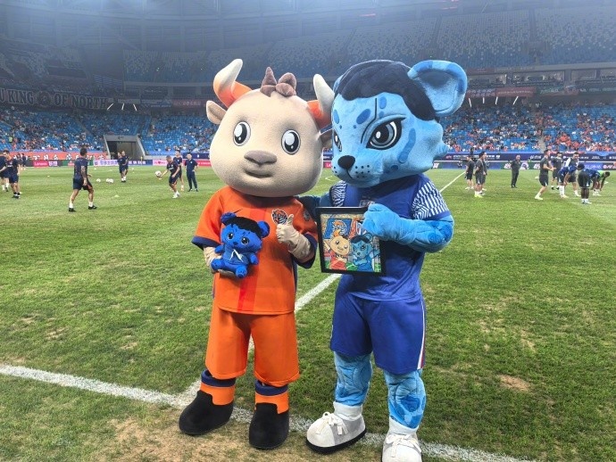 犇犇和布鲁续写友谊,宽容芳华足球场第一位客队祯祥物