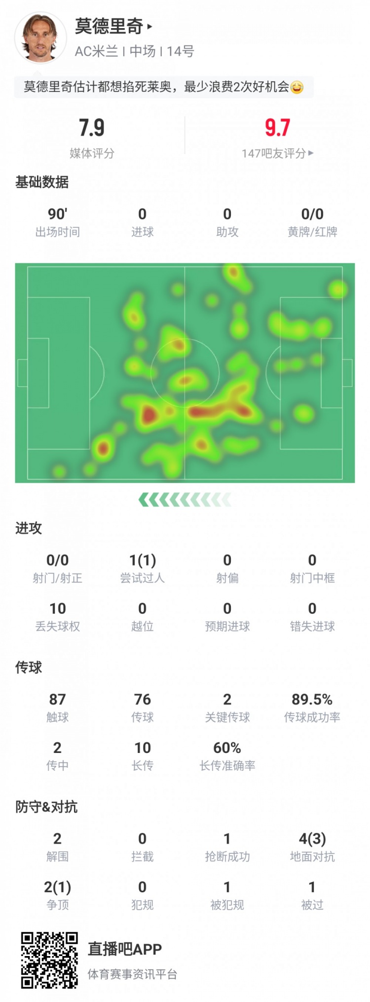 莫德里奇本场数据:踢满全场,关节传球2次,传球得胜率89.5%
