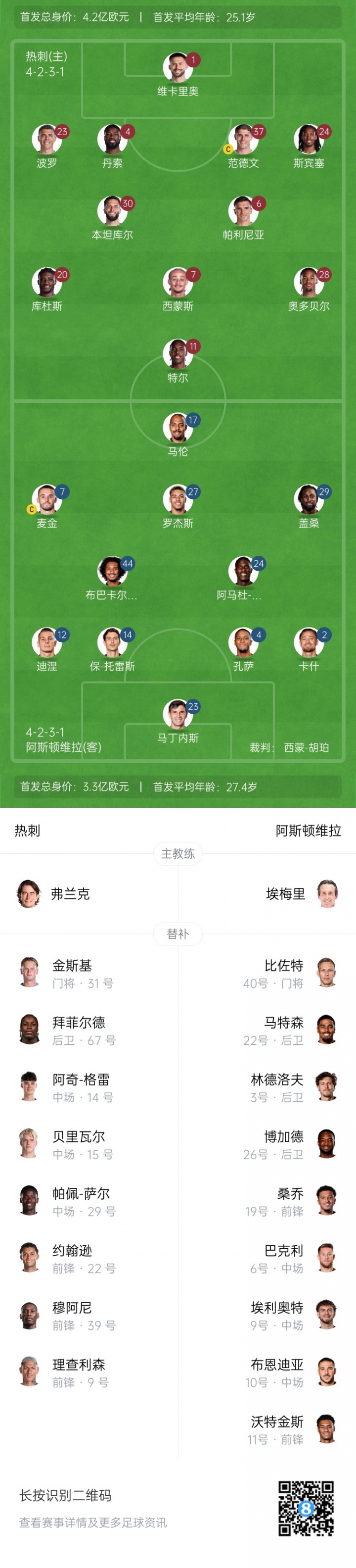 阿斯顿维拉首发:23-马丁内斯、4-孔萨、12-迪涅、14-保·托雷斯、2-卡什、7-麦金、24-阿马杜·奥纳纳、27-罗杰斯、44-布巴卡尔·卡马拉、17-马伦、29-盖桑