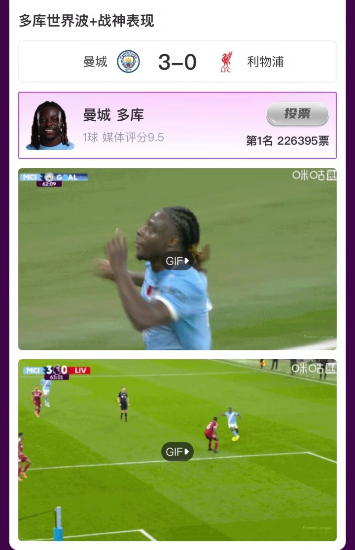 在曼城3-0打败利物浦的焦点大战中,多库不仅孝顺精彩天下波破门,还有1次造点、3次关节传球,7次得胜+11次起义得胜全场最高,得到吧友超22万的投票,当选【X咪咕体育英超第11轮最好球员】!