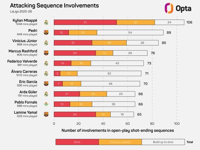 本赛季西甲参与灵验遑急名次:姆巴佩106次居首,佩德里89治安二