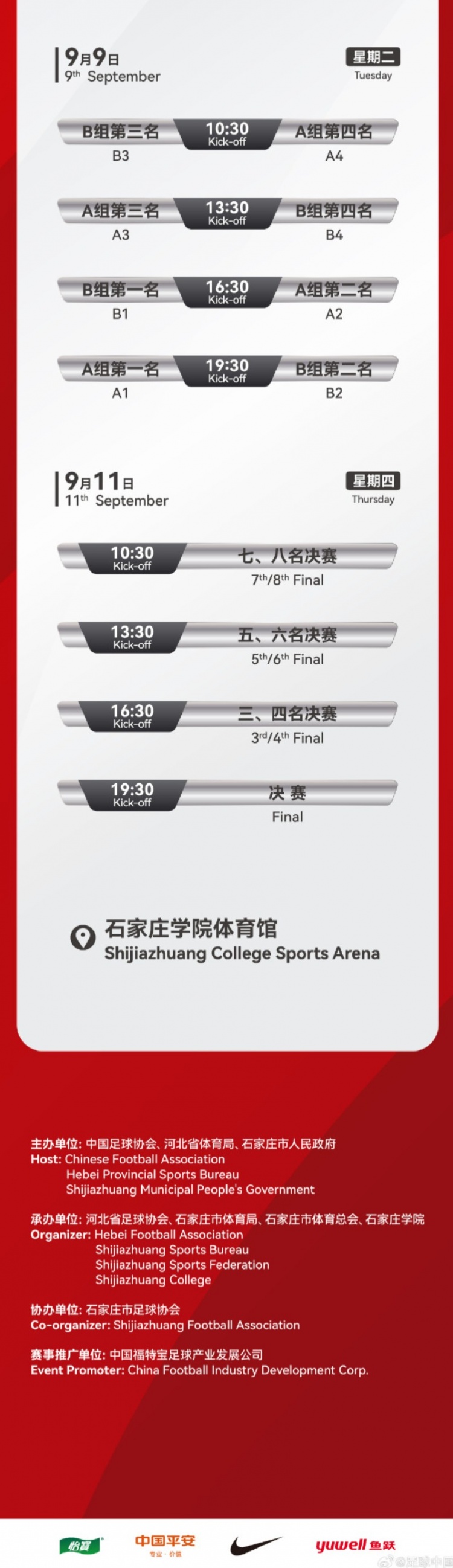 2025CFA中国之队·“北东说念主集团”石家庄五东说念主制足球海外邀请赛赛程公布!中国国度须眉五东说念主制足球队与柬埔寨须眉五东说念主制足球队、丹麦须眉五东说念主制足球队、印度尼西亚须眉五东说念主制足球队、韩国须眉五东说念主制足球队、缅甸须眉五东说念主制足球队、新西兰须眉五东说念主制足球队、阿联酋须眉五东说念主制足球队九月约战河北石家庄。