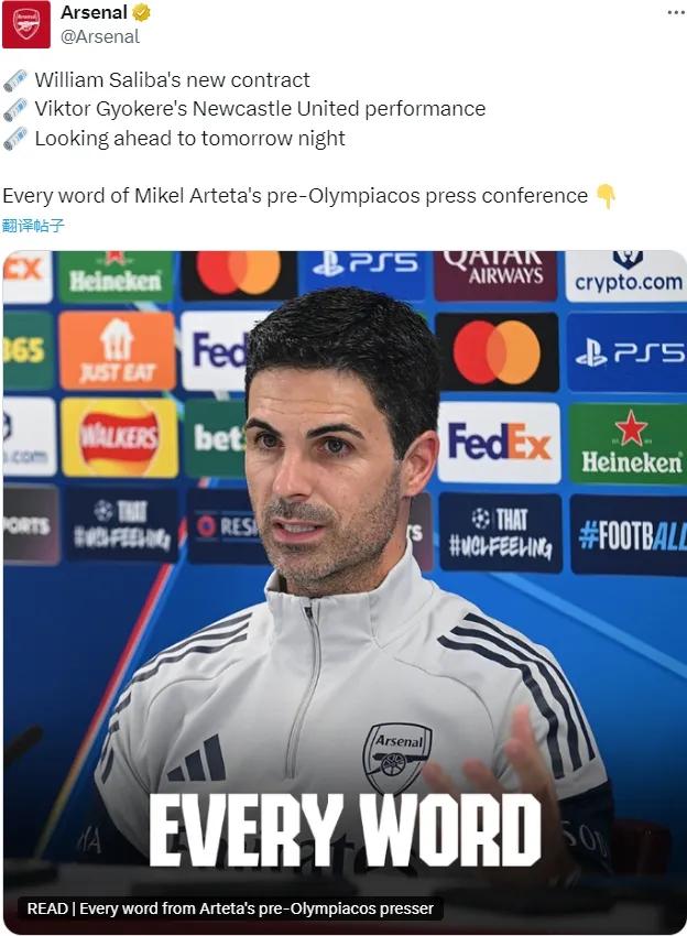 阿尔特塔在赛前新闻发布会上谈到了球队的伤病问题。