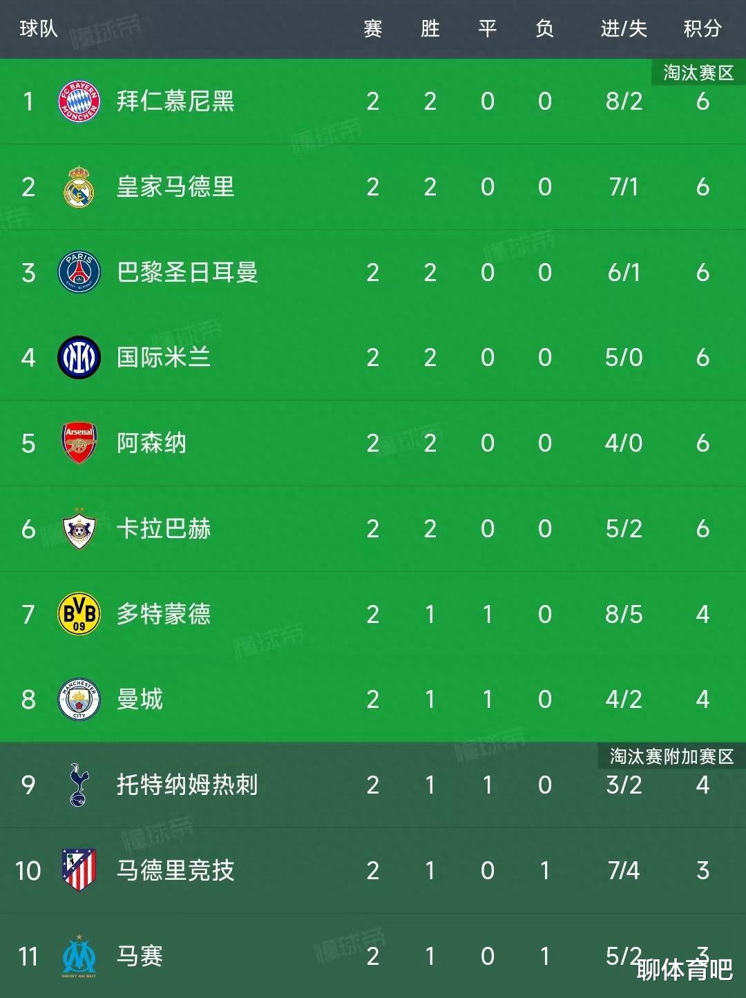 欧冠第二轮齐备了通盘比赛, 最新积分榜如下!