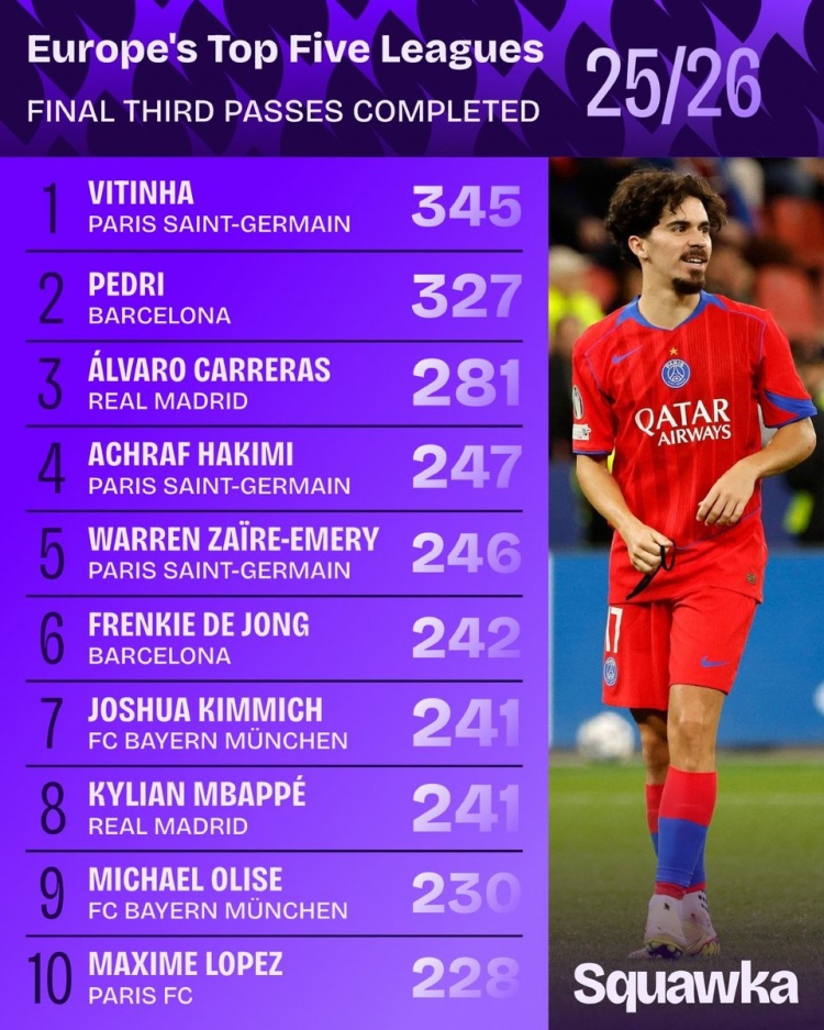 345次!维蒂尼亚的进军三区完成传球次数位列五大联赛第一