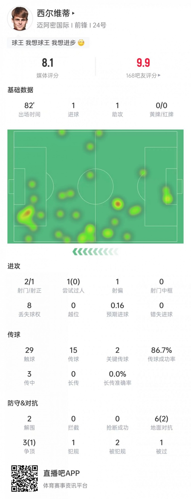西尔维蒂本场数据:传射立功,2次时弊传球+3次传中,获评8.1分