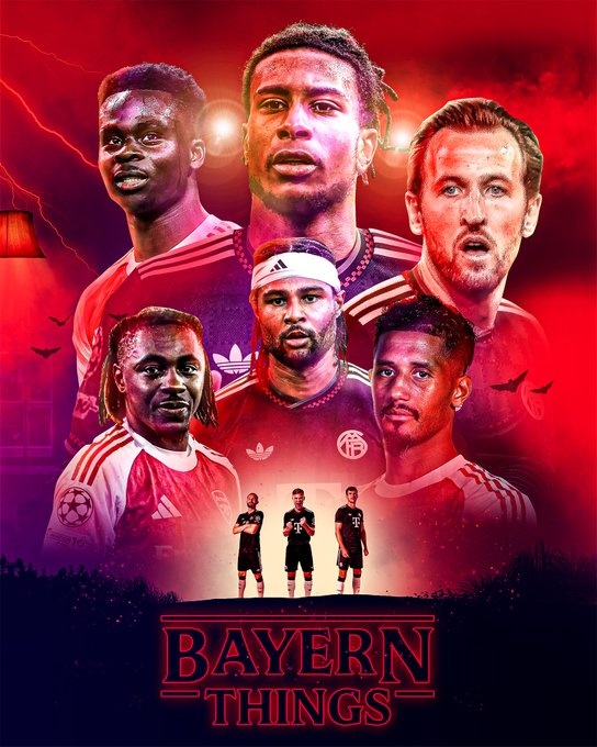 11月25日讯 北京时间周三凌晨的欧冠联赛阶段第5轮比赛,拜仁将赶赴酋长球场挑战阿森纳。现在,拜仁发布了预热海报,萨利巴、格纳布里、埃泽、凯恩、奥利塞以及萨卡整个出镜。值得一提的是,拜仁制作的海报联动了大热好意思剧《怪奇物语》。
