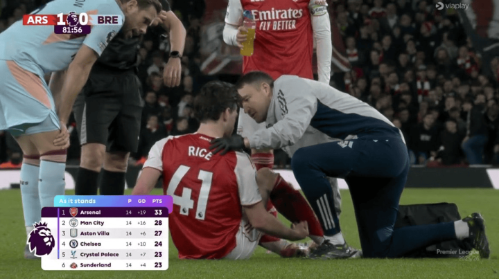德克兰-赖斯似乎小腿受伤,不得不下场休息。