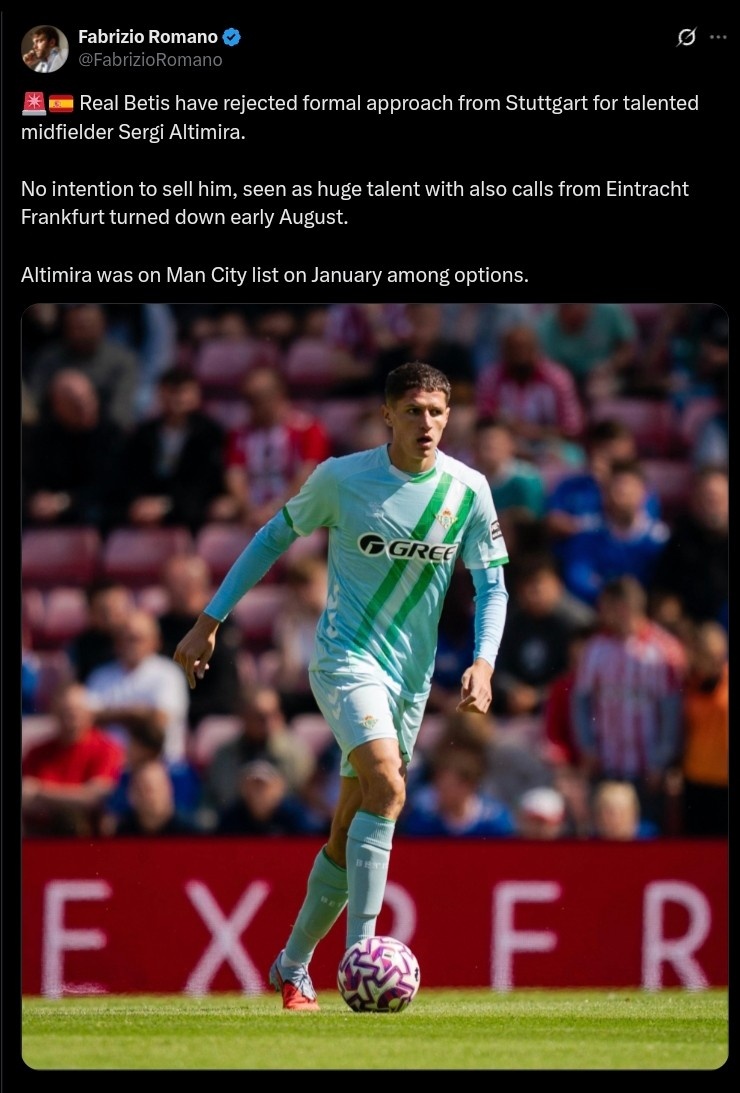 8月26日讯 据有名转会人人罗马诺报谈,贝蒂斯一经隔断了斯图加特关于24岁中场阿尔蒂米拉的正经报价。