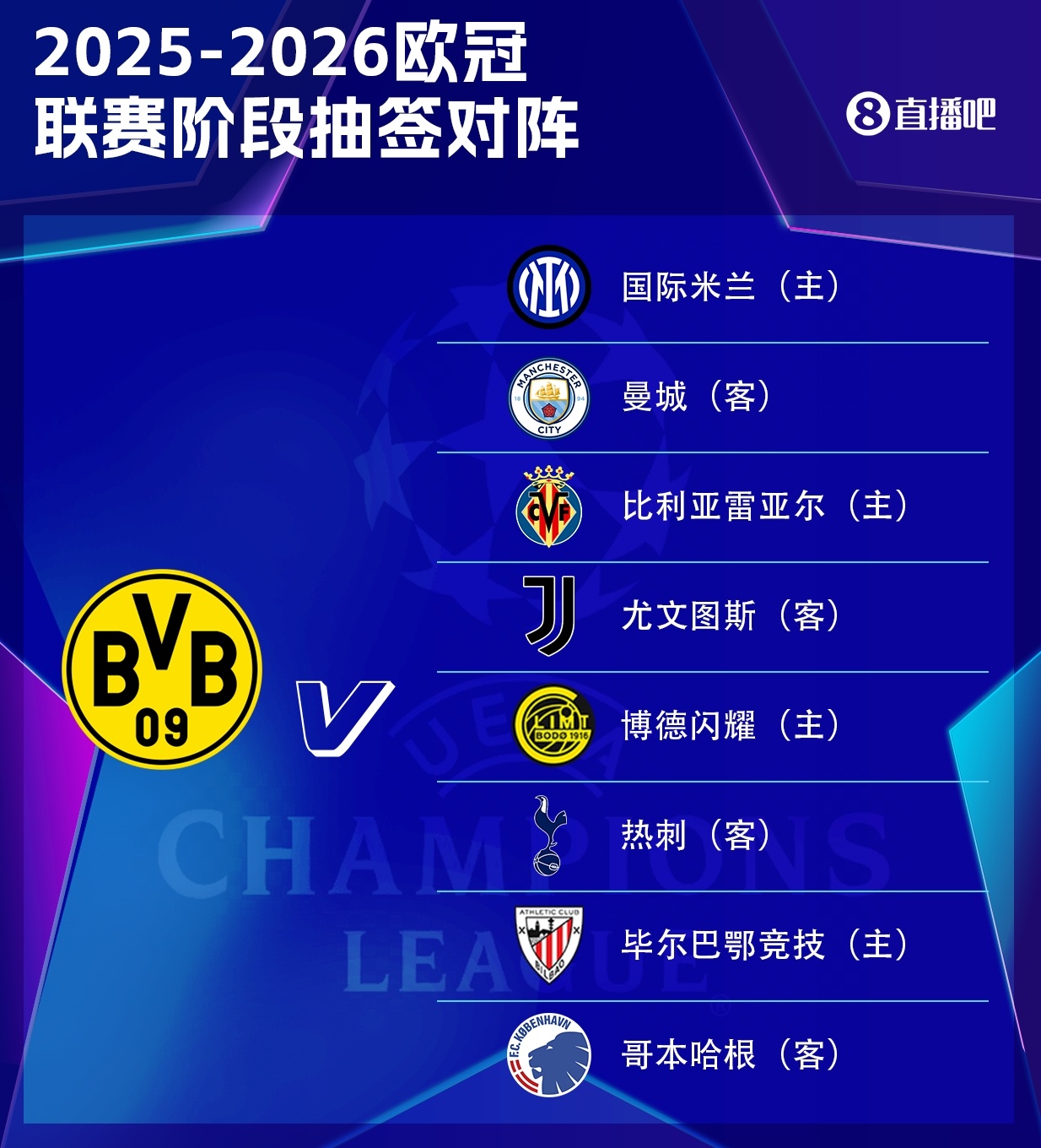 8月30日讯 欧足联公布了欧冠联赛阶段的详备赛程,每支球队将分手进行4场主场和4场客场比赛,以下为多特蒙德具体赛程(北京技术):
