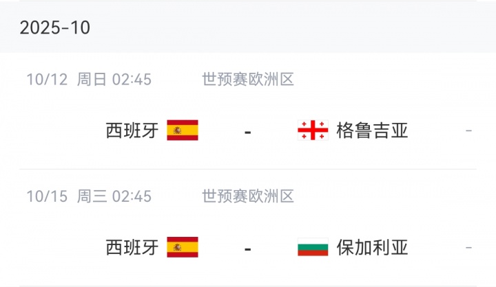 西班牙将在10月12日和15日分歧对阵格鲁吉亚和保加利亚。