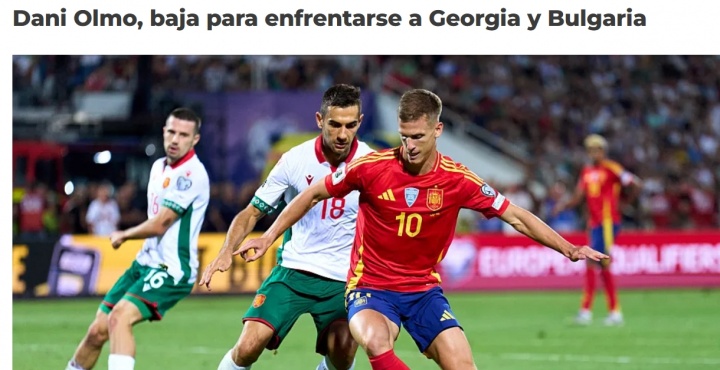 达尼·奥尔莫将因伤无法插足在埃尔切对阵格鲁吉亚及在巴利亚多利德对阵保加利亚的比赛。