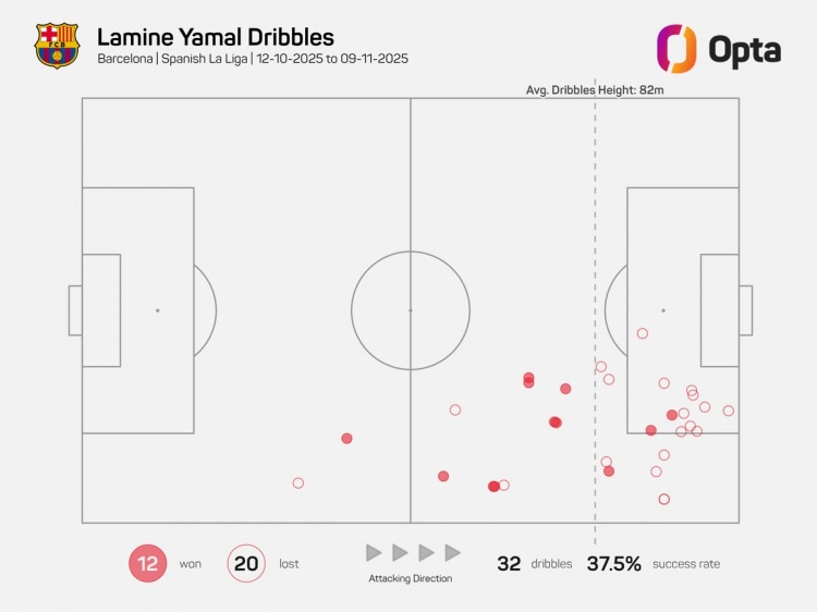 Opta指出,10月12日以来,亚马尔联赛尝试过东谈主32次,与图卢兹球员博霍并排五大联赛最多,过东谈主奏效劳37.5%。